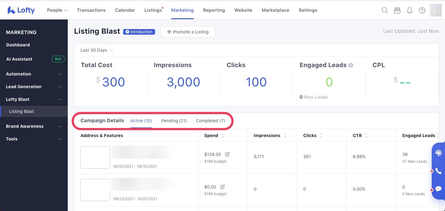 Listing Blast (formerly Listing Promotion Ads) is a tool designed to save time and simplify your digital marketing efforts--all directly in the Lofty platform. This tool is designed to promote your listings on Facebook and Instagram. With this tool, you can: